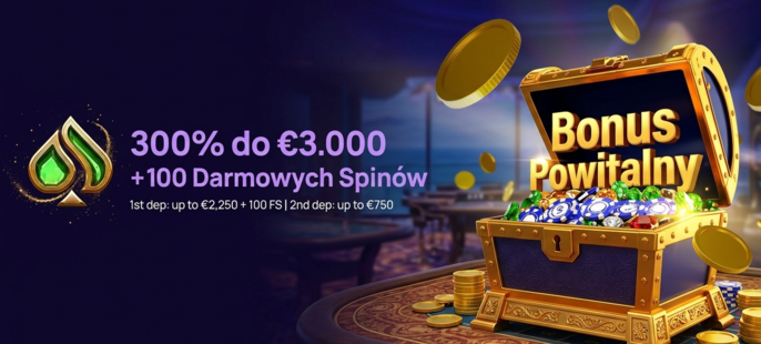 Bonus 300% do 3 000€ z 100 darmowymi spinami, rozłożony na dwa depozyty. Pierwsza wpłata daje do 2 250€ + 100 FS, druga – do 750€. Wszystkie środki bonusowe podlegają 50-krotnemu obrotowi.